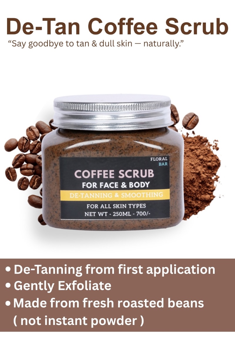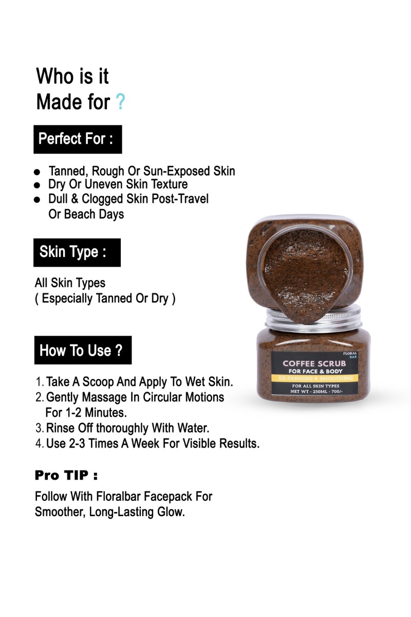This Coffee scrub is too good for All skin types, after using scrub skin was like smooth and glowing, Even used after 4 to 5 time tanning also removed from the skin. Product has no chemical only used natural ingredients I used it’s worth it. Thank you floralbar coffee scrub 😇..