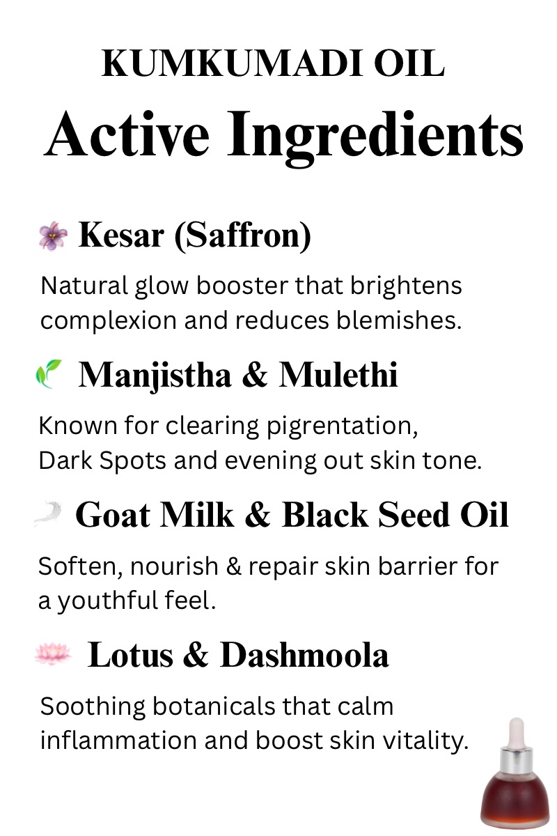 This isn’t just an oil — it’s a 1000-year-old beauty secret. Prepared through the traditional Ayurvedic method of taila paka (oil infusion & reduction), it blends saffron, herbs, roots, and flowers in sesame oil & goat milk to deeply rejuvenate skin.